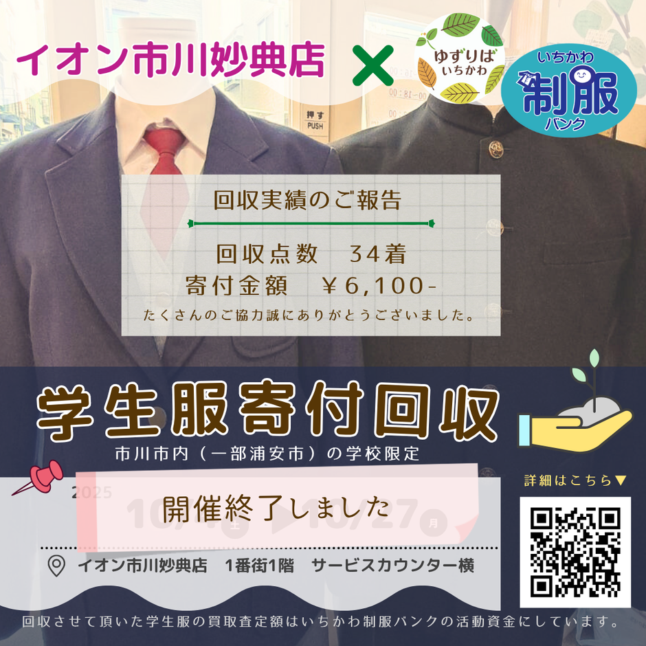 この度、学生服の寄付回収をイオン市川妙典店さんにご協力頂くことになりました。 受付期間:10/4(土)~10/27(月)まで 回収場所:1番街1階サービスカウンター横(イオン銀行様との間) 対象エリア:市川市内学校(幼稚園・小学校・中学校・高校)、浦安市内(中学校、高校) 対象商品:制服、体操服(高校を除く)、鞄など...
