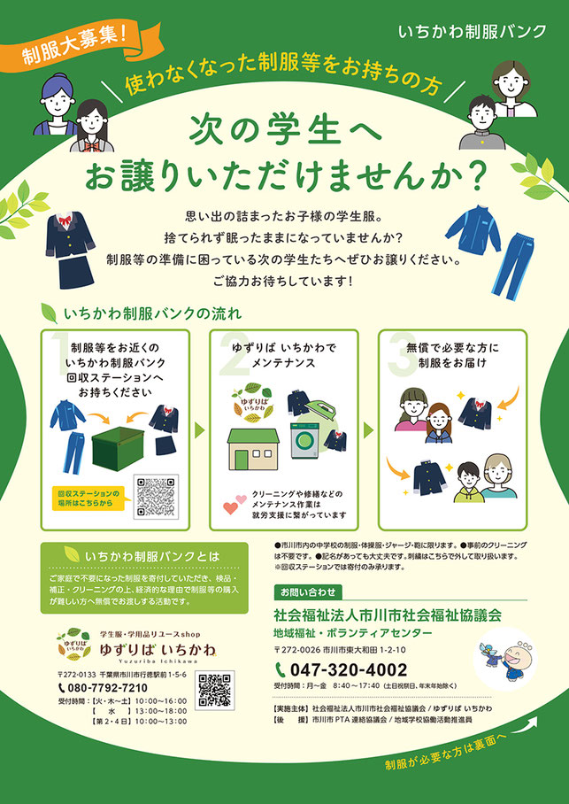 こちらの寄付相当額については、学生服無償支援「いちかわ制服バンク」活動費に充当いたします。